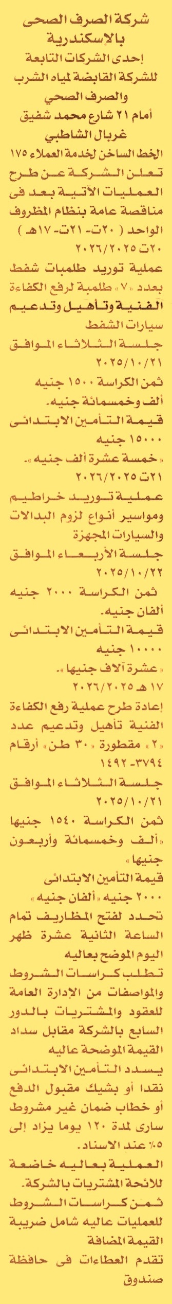 HOT Information مناقصة عامة رقم 20ت/2025/2026 لعملية توريد 7 طلمبات شفط لرفع الكفاءة الفنية وتأهيل وتدعيم سيارات الشفط (مدة سريان خطاب الضمان 4 أشهر) عن جريدة الأخبار Post navigation شركة النيل العامة للإنشاء والطرق جامعة المنيا