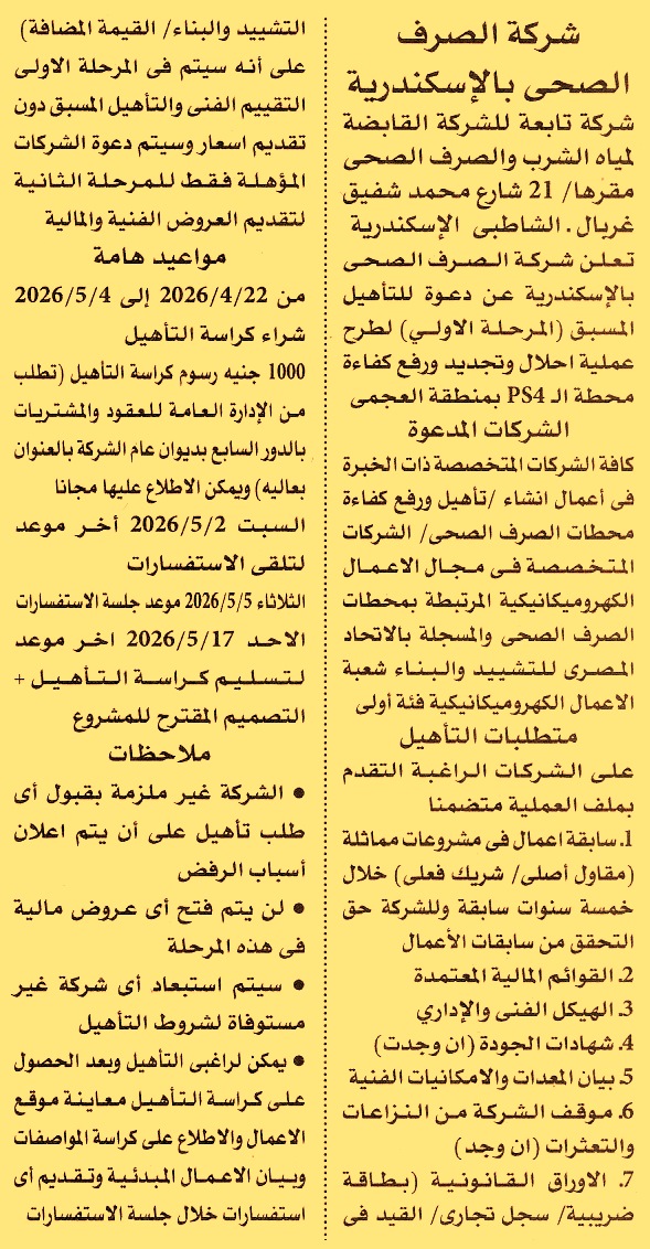 وأخر موعد لتسليم كراسة التأهيل والتصميم المقترح يوم 17/5/2026)