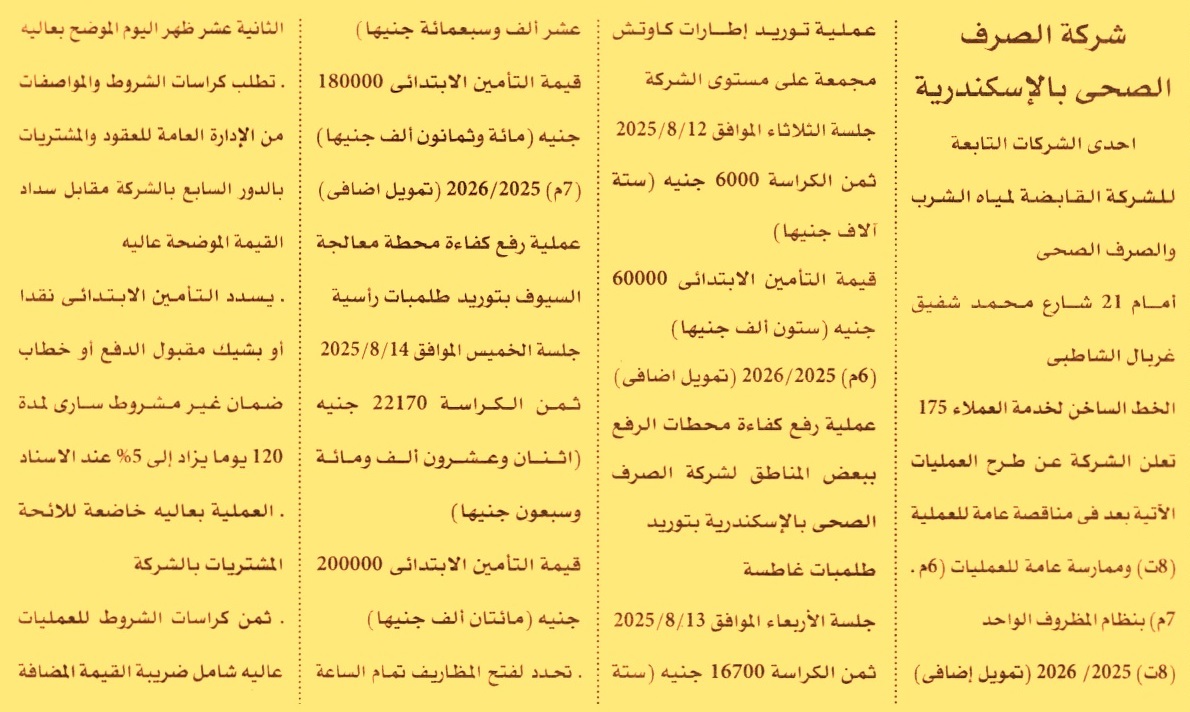 HOT Information مناقصة عامة رقم 8ت/2025/2026 لعملية توريد إطارات كاوتش مجمعة على مستوى الشركة (مدة سريان خطاب الضمان 4 أشهر) عن جريدة الأهرام Post navigation شركة النيل العامة للطرق والكباري جهاز تنمية مدينة النوبارية الجديدة