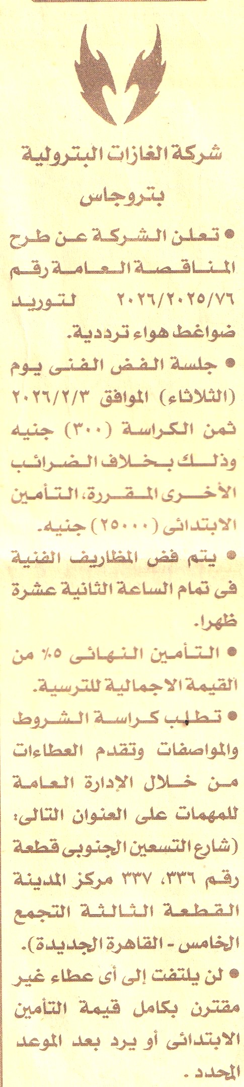 HOT information مناقصة عامة رقم 76/2025/2026 لعملية توريد ضواغط هواء ترددية عن جريدة الأخبار Post navigation محافظة الدقهلية رئاسة حي غرب المنصورة جامعة المنوفية الإدارة العامة للمدن الجامعية