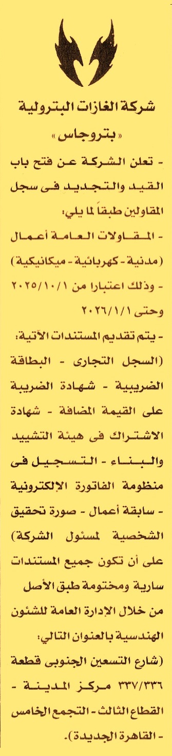 HOT information فتح باب القيد وتجديد القيد في سجل المقاولين في مجال المقاولات العامة أعمال “مدنية, كهربائية, ميكانيكية” عن جريدة الأخبار Post navigation مؤسسة بهية