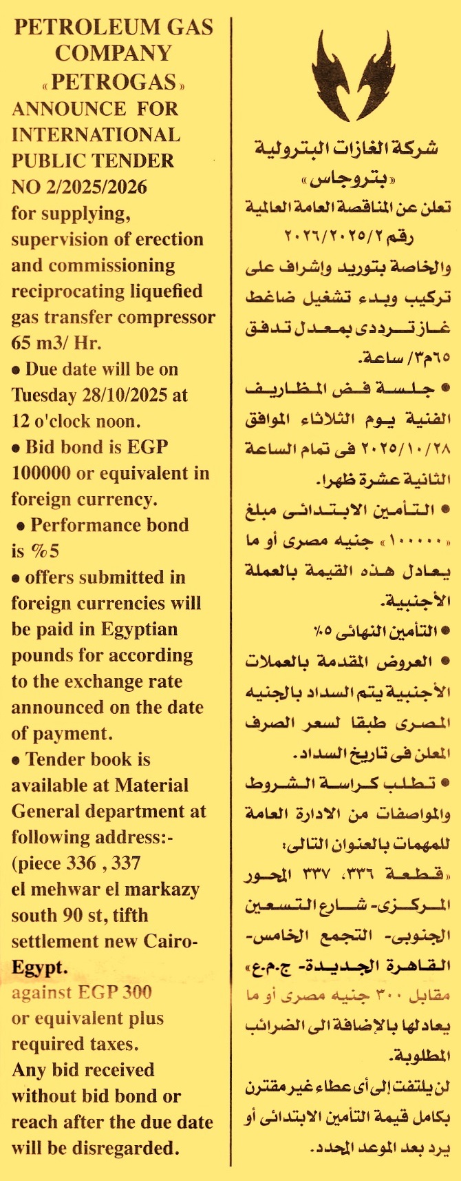 HOT Information منافصة عالمية عامة رقم 2/2025/2026 لعملية توريد وإشراف على تركيب وبدء تشغيل ضاغط غاز ترددي بمعدل تدفق 65م3/ساعة عن جريدة الأخبار Post navigation الهيئة العامة لموانئ البحر الأحمر جهاز القرى السياحية