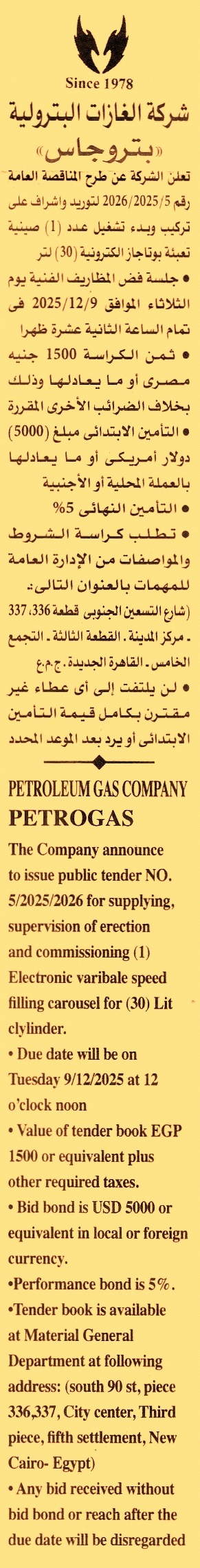 HOT Information منافصة عامة رقم 5/2025/2026 لعملية توريد وإشراف على تركيب وبدء تشغيل عدد 1 صينية تعبئة بوتاجاز الكترونية 30 لتر عن جريدة الأهرام Post navigation حي ثان الإسماعيلية الجهاز التنفيذي للمشروعات الصناعية والتعدينية