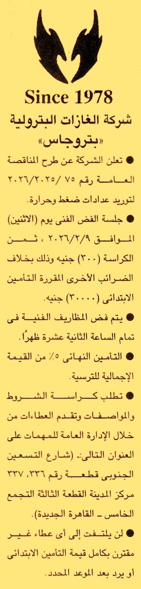 HOT Information منافصة عامة رقم 75/2025/2026 لعملية توريد عدادات ضغط وحرارة عن جريدة الجمهورية Post navigation مديرية الطرق والنقل بأسيوط مركز شباب بشتيل