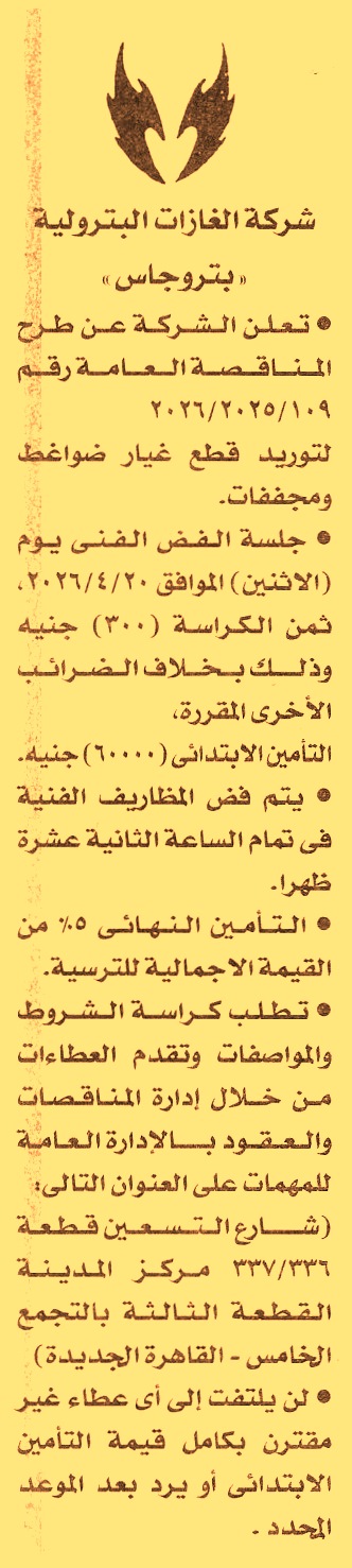 HOT Information منافصة عامة رقم 109/2025/2026 لعملية توريد قطع غيار ضواغط ومجففات عن جريدة الأخبار Post navigation شركة مياه الشرب والصرف الصحي بالمنيا شركة الخدمات الطبية