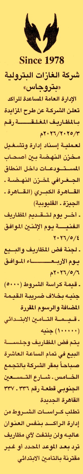 HOT Information مزايدة عامة رقم 3/2025/2026 لعملية إدارة وتشغيل مخزن النهضة بين أصحاب المستودعات داخل النطاق الجغرافي لمخزن النهضة بالقاهرة الكبرى “القاهرة, الجيزة, القليوبية” (أخر موعد لتقديم العطاءات يوم 4/5/2026) عن جريدة الجمهورية Post navigation مركز التنمية الشبابية بكفر سعد جمعية صقر قريش