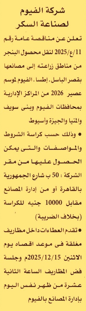 نقل محصول البنجر من مناطق زراعته إلى مصانع الشركة بقصر الباسل, إطسا, الفيوم لموسم عصير 2026