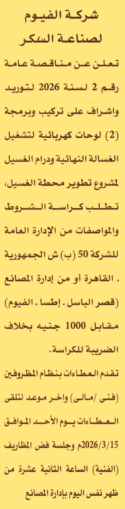 HOT information مناقصة عامة رقم 2/2025 لعملية توريد واشراف على تركيب وبرمجة 2 لوحات كهربائية لتشغيل الغسالة النهائية ودرام الغسيل لمشروع تطوير محطة الغسيل عن جريدة الأهرام Post navigation مركز شباب مدينة مطاي الهيئة القومية لسكك حديد مصر