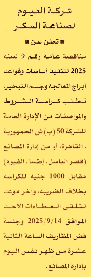 HOT Information مناقصة عامة رقم 9/2025 لعملية تنفيذ أساسات وقواعد أبراج المعالجة وجسم التبخير عن جريدة الأهرام Post navigation الهيئة المصرية العامة للتنشيط السياحي الهيئة العامة للرعاية الصحية بمحافظة الأقصر