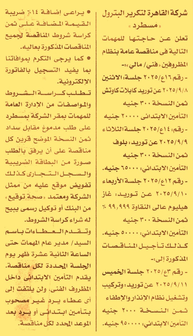 HOT Information مناقصة عامة رقم 16ع/2025 لعملية توريد كابلات كاوتش عن جريدة الأخبار Post navigation شركة مطاحن مصر العليا مركز التنمية الشبابية بالكوم الأخضر