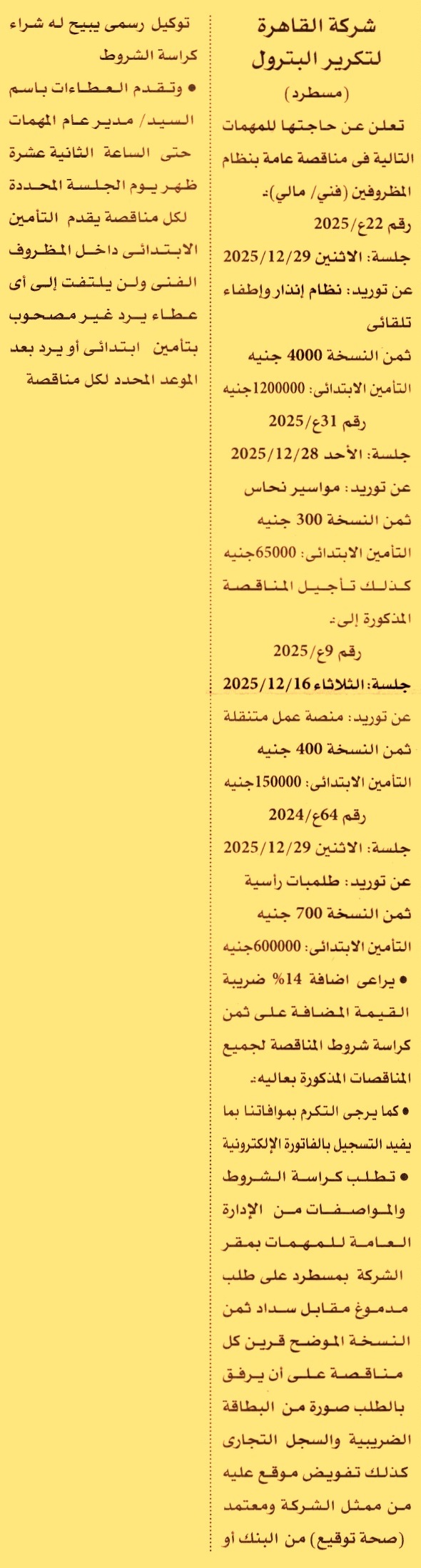HOT Information مناقصة عامة رقم 22ع/2025 لعملية توريد نظام إنذار وإطفاء تلقائي عن جريدة الأهرام Post navigation جامعة جنوب الوادي الأهلية بقنا شركة مصر لصناعة الكيماويات