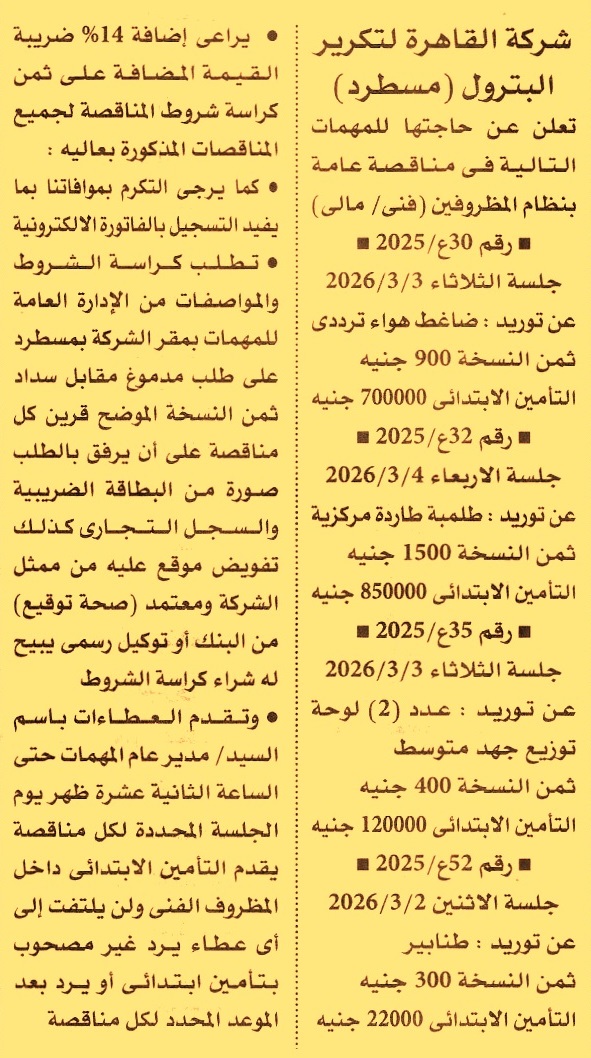 HOT Information مناقصة عامة رقم 30ع/2025 لعملية توريد ضاغط هواء ترددي عن جريدة الأهرام Post navigation مكتب النائب العام الإدارة العامة للموارد المائية والري بغرب الشرقية