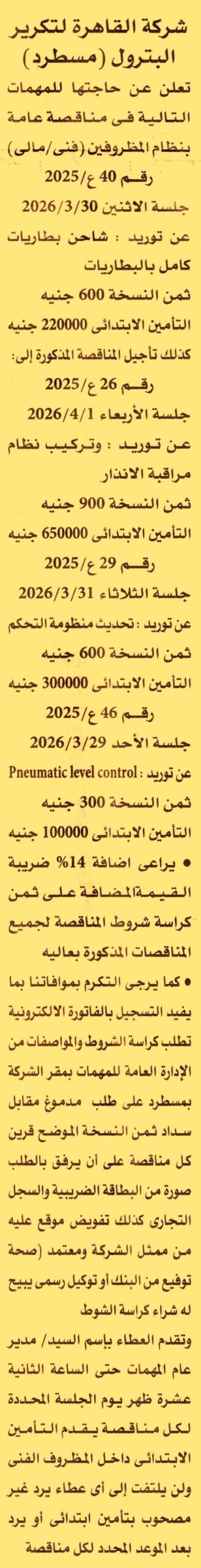 HOT Information مناقصة عامة رقم 40ع/2025 لعملية توريد شاحن بطاريات كامل بالبطاريات عن جريدة الأهرام Post navigation البورصة المصرية محافظة الإسكندرية