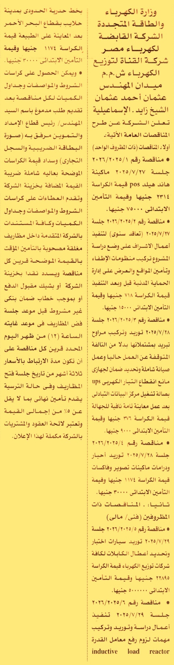 HOT Information مناقصة عامة رقم 1/2025/2026 لعملية توريد ماكينة هاند هيلد POS (يسدد التأمين نقدا أو بشيك أو بخطاب ضمان ومدة الارتباط بالأسعار 3 أشهر) عن جريدة الأهرام Post navigation الهيئة العامة للرقابة المالية جامعة القاهرة