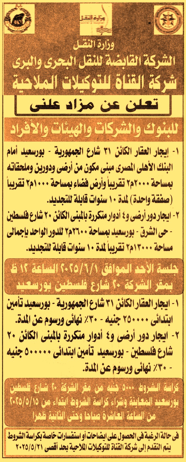 (1) العقار الكائن 31 شارع الجمهورية – بورسعيد أمام البنك الأهلي المصري مبنى مكون من أرضي ودورين وملحقاته بمساحة 2000م2 تقريبا وأرض فضاء بمساحة 1000م2 تقريبا “صفقة واحدة” لمدة 10 سنوات قابلة للتجديد