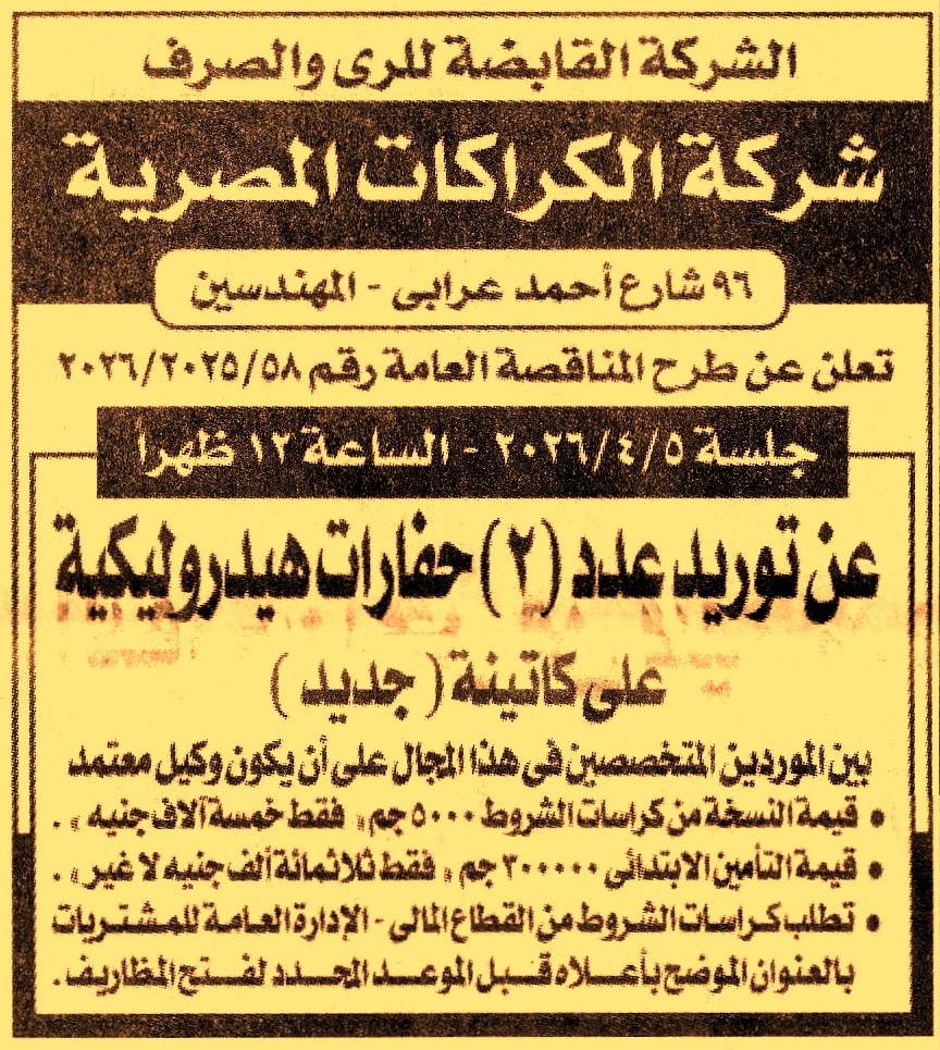 HOT information مناقصة عامة رقم 58/2025/2026 لعملية توريد عدد 2 حفارات هيدروليكية على كاتينة “جديد” عن جريدة الجمهورية Post navigation الهيئة القومية لسكك حديد مصر محافظة أسيوط
