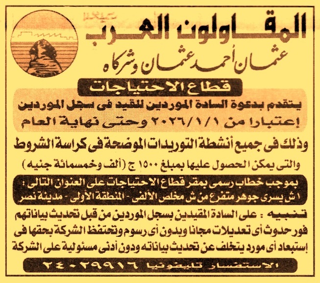 HOT Information فتح باب القيد بسجل الموردين عن جريدة الأهرام Post navigation شركة البحر الأحمر لصناعة المنتجات الخرسانية ومعداتها