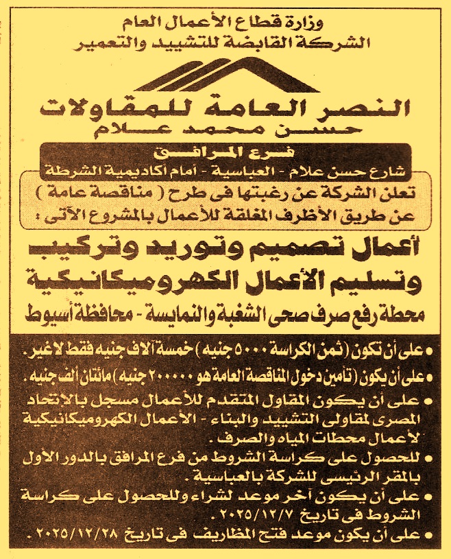 HOT Information مناقصة عامة لعملية تنفيذ أعمال تصميم وتوريد وتركيب وتسليم الأعمال الكهروميكانيكية محطة رفع صرف صحي الشغبة والنمايسة – محافظة أسيوط (تباع الكراسة في موعد أقصاه يوم 7/12/2025) عن جريدة الجمهورية Post navigation جهاز تنمية مدينة حدائق أكتوبر وزارة الموارد المائية والري