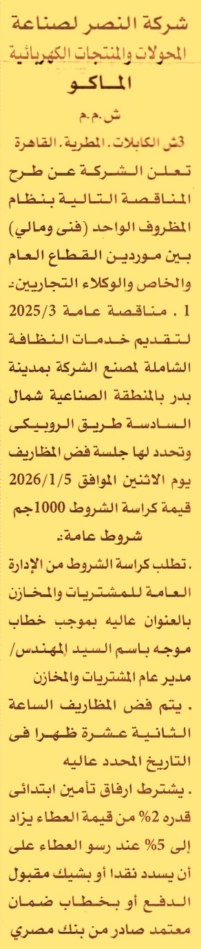 HOT Information مناقصة عامة رقم 3/2025 لعملية تقديم خدمات النظافة الشاملة لمصنع الشركة بمدينة بدر بالمنطقة الصناعية شمال السادسة طريق الروبيكي عن جريدة الأهرام Post navigation الإدارة العامة لمشروعات صرف مصر العليا بقنا شركة مصر العامرية للغزل والنسيج