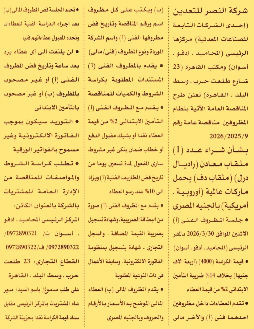 HOT Information مناقصة عامة رقم 9/2025/2026 لعملية توريد عدد 1 مثقاب معادن “راديال درل” مثقاف دف يحمل ماركات عالمية “أوروبية – أمريكية” (يسدد التأمين نقدا أو بشيك أو بخطاب ضمان ساري لمدة 3 أشهر ويرفق مع المستندات سابقة أعمال) عن جريدة الأهرام Post navigation شركة مصر للطيران للصيانة والأعمال الفنية شركة النصر للتعدين