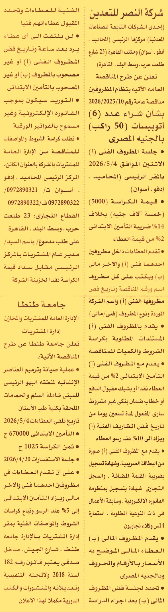 HOT Information مناقصة عامة رقم 10/2025/2026 لعملية توريد عدد 6 أتوبيسات 50 راكب “بالجنيه المصري” (يسدد التأمين نقدا أو بشيك أو بخطاب ضمان ساري لمدة 3 أشهر ويرفق مع المستندات سابقة أعمال واستمارة 14س وكلاء تجاريون) عن جريدة الأهرام Post navigation مكتب النائب العام جامعة طنطا