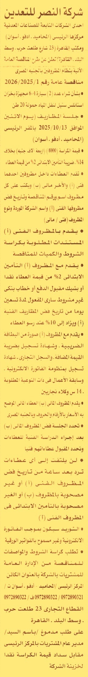 توريد عدد 2 سيارة 4×6 مجهزة بخزان استانلس ستيل لنقل المياه حمولة 20 طن
