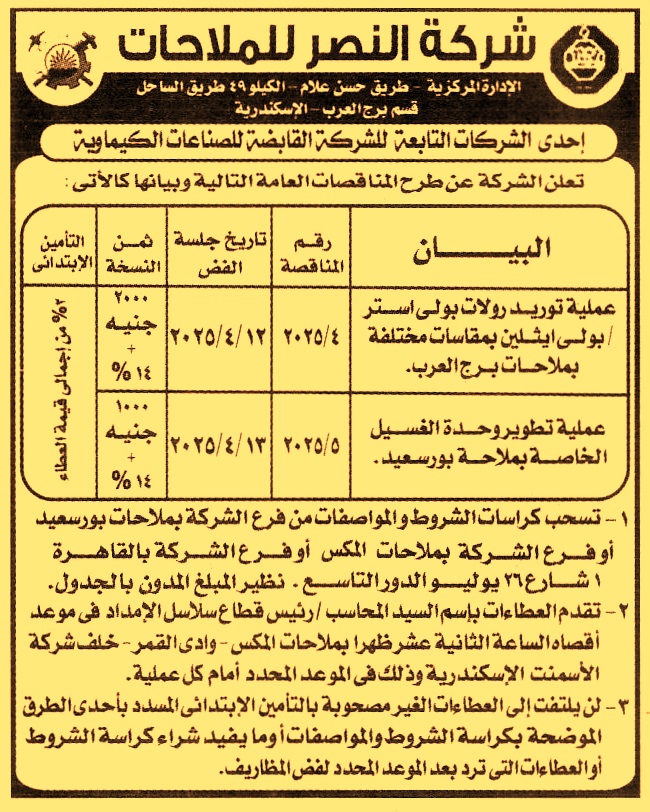 HOT Information مناقصة عامة رقم 4/2025 لعملية توريد رولات بولي استر/ بولي ايثلين بمقاسات مختلفة بملاحات برج العرب عن جريدة الجمهورية Post navigation الجمعية التعاونية للبناء والاسكان للعاملين بالجهاز المركزي للمحاسبات بالمنيا محافظة الإسماعيلية