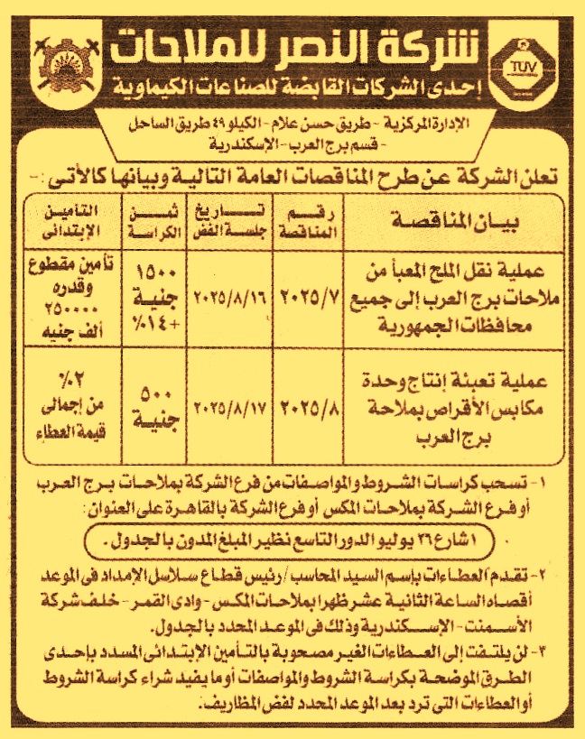 HOT Information مناقصة عامة رقم 7/2025 لعملية نقل الملح المعبأ من ملاحات برج العرب إلى جميع محافظات الجمهورية عن جريدة الجمهورية Post navigation جامعة بنها شركة مياه الشرب والصرف الصحي بالمنيا