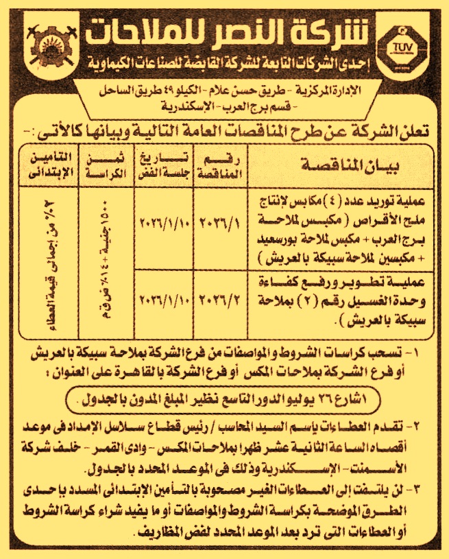 “مكبس لملاحة برج العرب ومكبس لملاحة بورسعيد ومكبسين لملاحة سبيكة بالعريش”