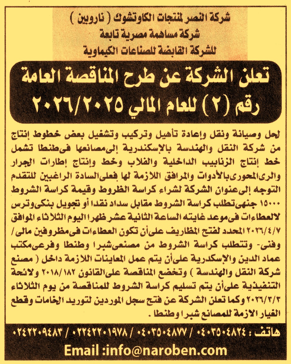 حل وصيانة ونقل وإعادة تأهيل وتركيب وتشغيل بعض خطوط إنتاج من شركة النقل والهندسة بالإسكندرية