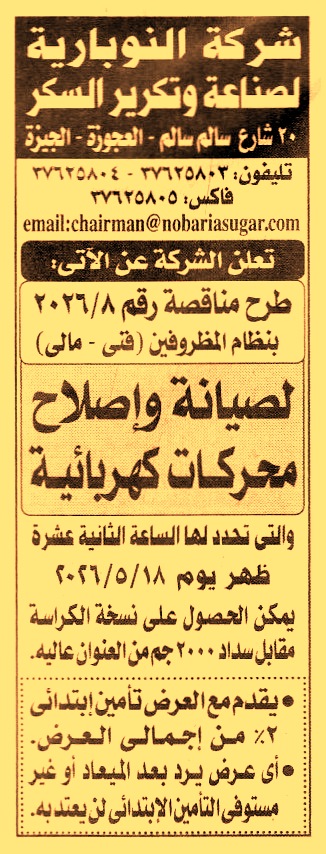 HOT information مناقصة عامة رقم 8/2026 لعملية صيانة وإصلاح محركات كهربائية عن جريدة الأخبار Post navigation الهيئة الوطنية للصحافة شركة مصر للبترول