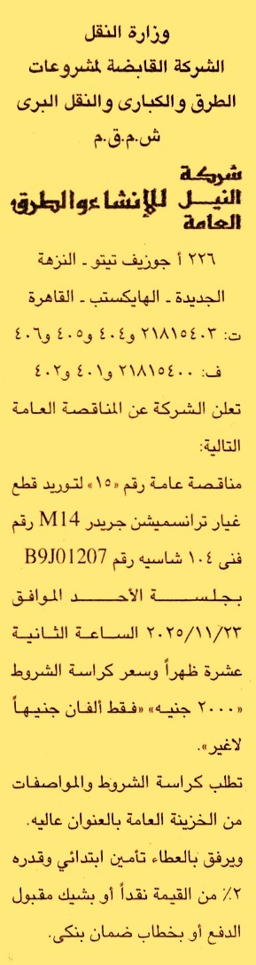 HOT information مناقصة عامة رقم 15 لعملية توريد قطع غيار ترانسميشن جريدر M14 رقم فني 104 شاسيه رقم B9J01207 عن جريدة الجمهورية Post navigation جهاز تنمية مدينة 6 أكتوبر مركز البحوث الزراعية