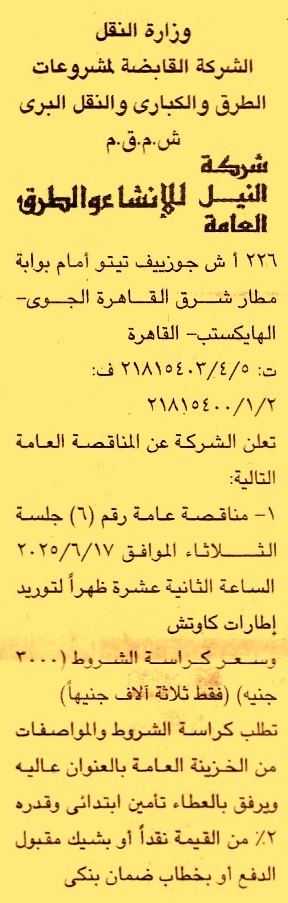 HOT Information مناقصة عامة رقم 6 لعملية توريد إطارات كاوتش عن جريدة الجمهورية Post navigation مركز شباب الخفيج الوحدة المحلية لحي شرق أسيوط