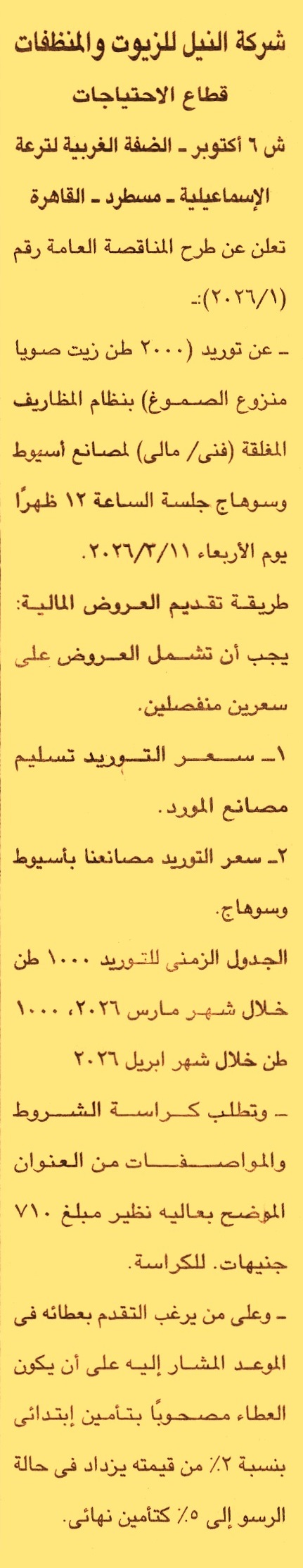 HOT information مناقصة عامة رقم 1/2026 لعملية توريد 2000 طن زيت صويا منزوع الصموغ عن جريدة الجمهورية Post navigation نادي صيد وادي النطرون شركة مطاحن ومخابز شمال القاهرة