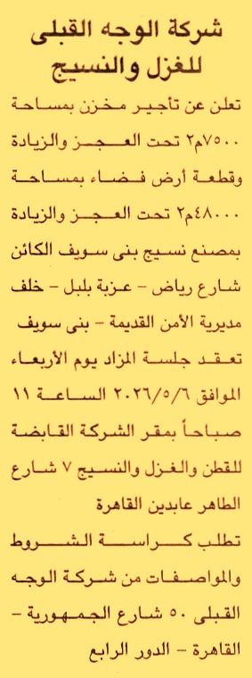 بمصنع نسيج بني سويف الكائن شارع رياض – عزبة بلبل – خلف مديرية الأمن القديمة – بني سويف