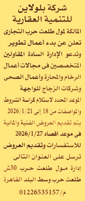 وأخر موعد لتقديم العطاءات يوم 27/1/2026)