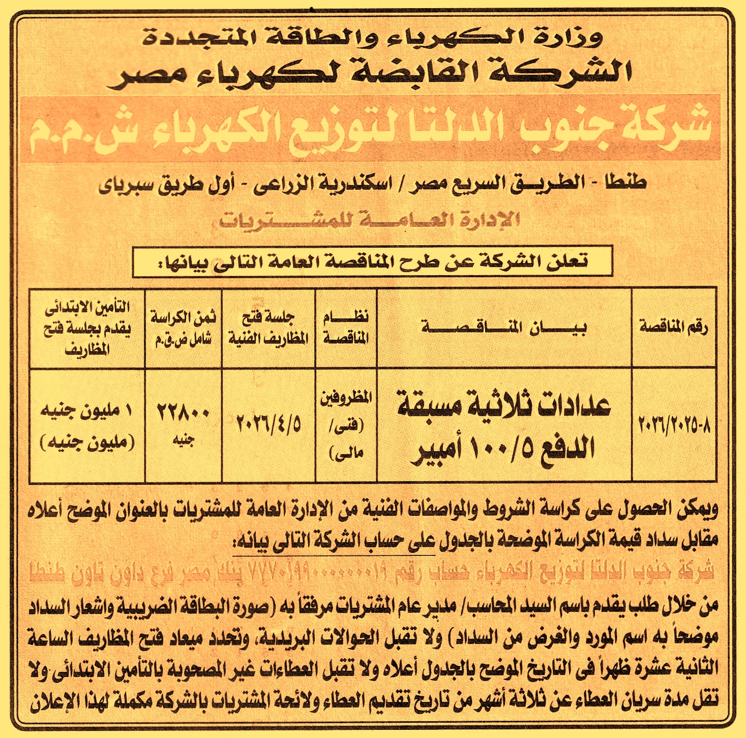 HOT Information مناقصة عامة رقم 8/2025/2026 لعملية توريد عدادات ثلاثية مسبقة الدفع 5/100 أمبير (مدة سريان خطاب الضمان 3 أشهر) عن جريدة الأخبار Post navigation الإدارة العامة لصرف شرق الفيوم مركز شباب النصر بمدينة العاشر من رمضان