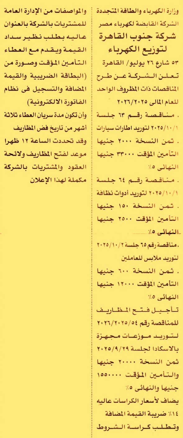 HOT Information مناقصة عامة رقم 63/2025/2026 لعملية توريد إطارات سيارات (مدة سريان العطاءات 3 أشهر) عن جريدة الأهرام Post navigation مستشفى طب الأزهر الجامعي مديرية المساحة بالمنوفية