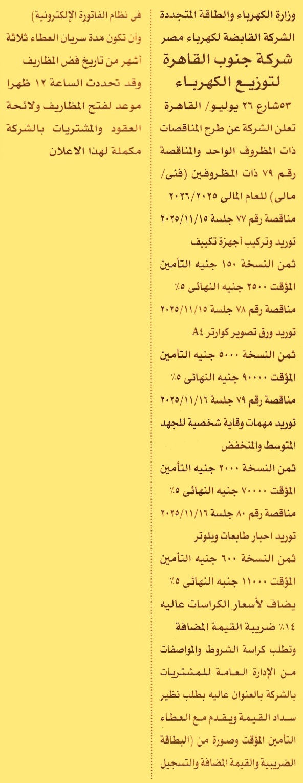 HOT Information مناقصة عامة رقم 77/2025/2026 لعملية توريد وتركيب أجهزة تكييف (مدة سريان العطاءات 3 أشهر) عن جريدة الأهرام Post navigation مؤسسة ساويرس للتنمية الاجتماعية مديرية الطب البيطري بسوهاج
