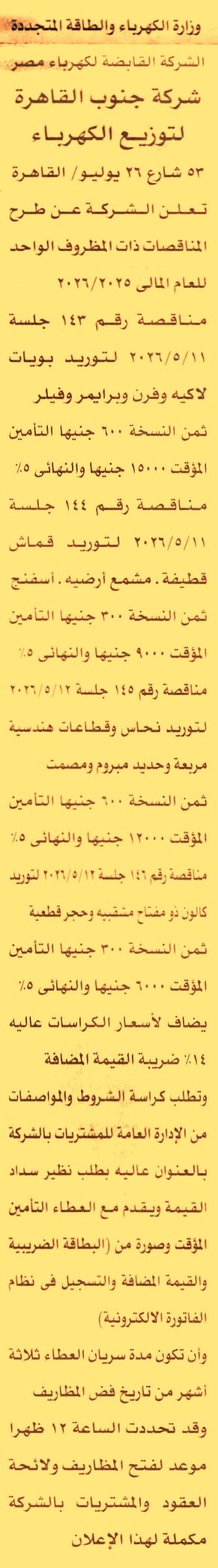 مناقصة عامة رقم 143/2025/2026 لعملية