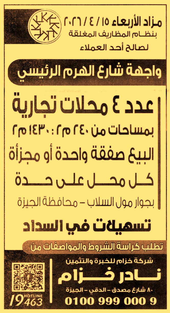 HOT information مزايدة علنية لعملية بيع عدد 4 محلات تجاري بمساحات من 240م2 إلى 1430م2 “البيع صفقة واحدة أو مجزأة كل محل على حدة” بجوار مول السلاب – محافظة الجيزة (تسهيلات في السداد) عن جريدة الأهرام Post navigation البنك الأهلي المصري شركة خزام للخبرة والتثمين نادر خزام