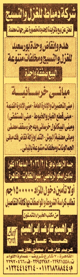 بيع هدم وأنقاض وحدة بورسعيد للغزل والنسيج ومخلفات متنوعة
