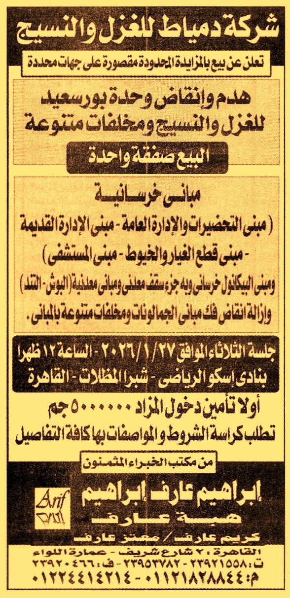 بيع هدم وأنقاض وحدة بورسعيد للغزل والنسيج ومخلفات متنوعة