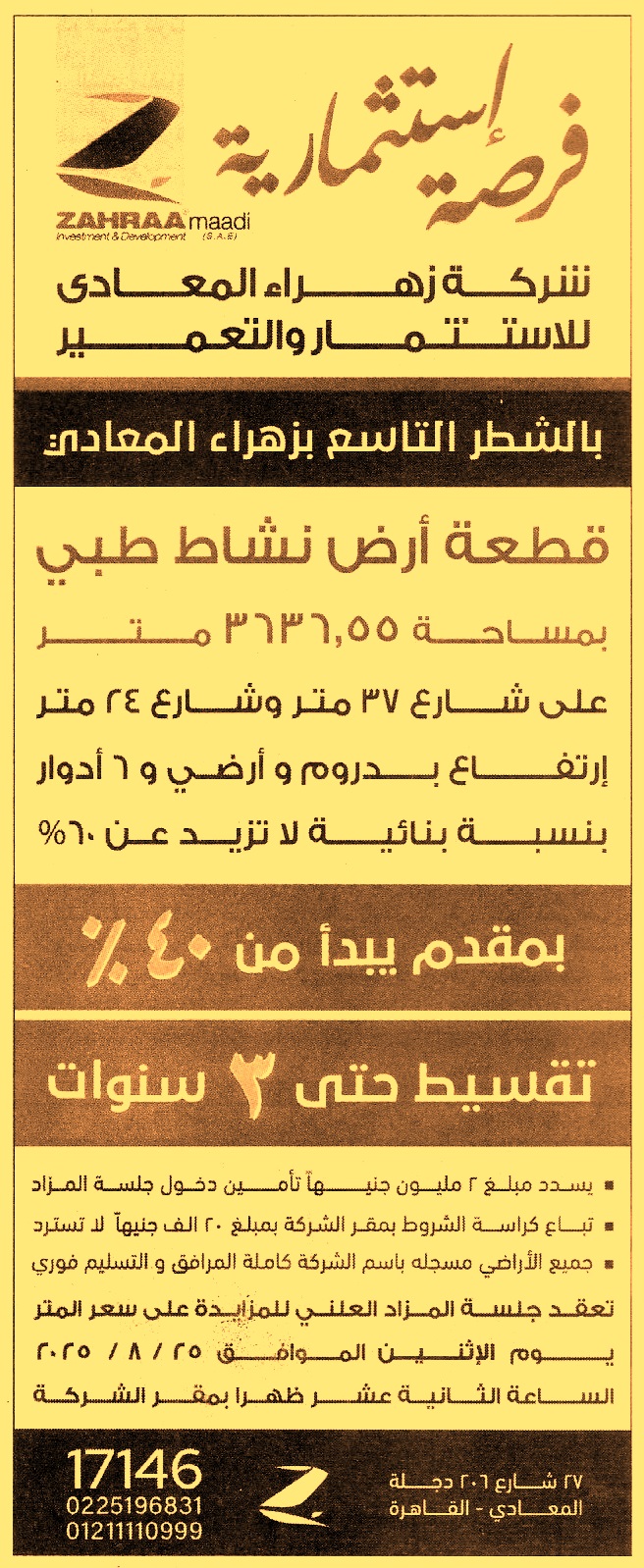 HOT Information مزايدة علنية لعملية بيع قطعة أرض بنشاط طبي بمساحة 3636.55م على شارع 37م وشارع 24م ارتفاع بدروم وأرضي و6 أدوار بنسبة بنائية لا تزيد عن 60% (بمقدم يبدأ من 40% وتقسيط حتى 3 سنوات) عن جريدة الأهرام Post navigation الجمعية التعاونية للبناء والإسكان للعاملين بالوحدة المحلية لمدينة سفاجا الهيئة العامة للأبنية التعليمية