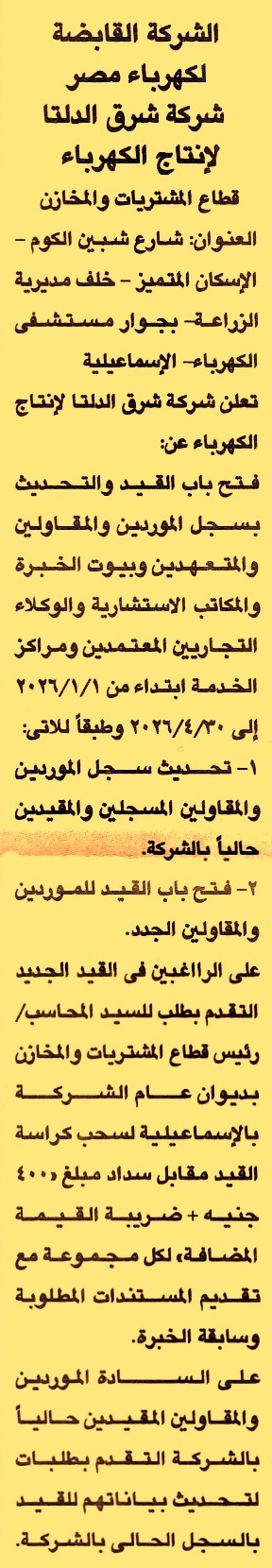 HOT Information فتح باب القيد والتحديث بسجل الموردين والمقاولين والمتعهدين وبيوت الخبرة والمكاتب الإستشارية والوكلاء التجاريين المعتمدين ومراكز الخدمة عن جريدة الجمهورية Post navigation البنك الاهلي المصري شركة مطاحن مصر الوسطى