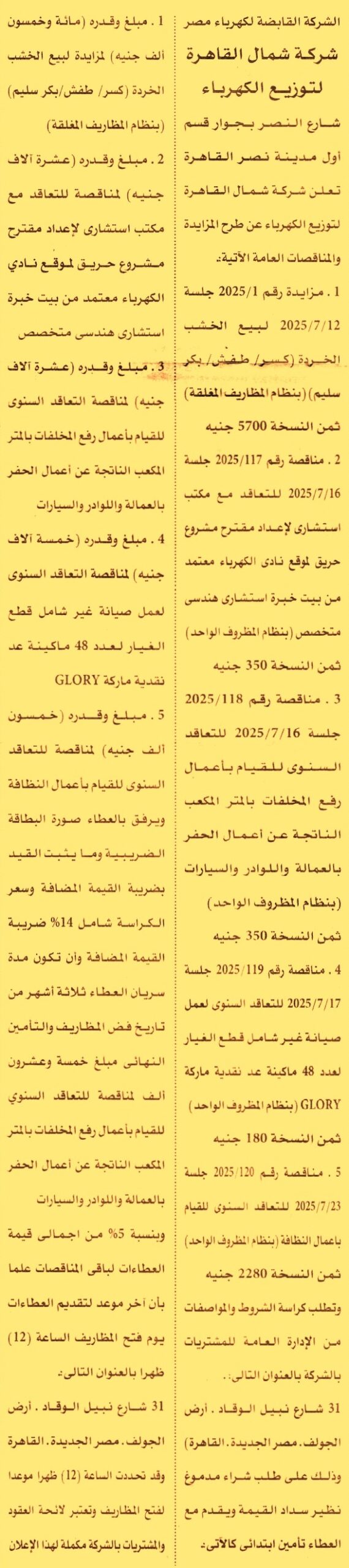 HOT Information مناقصة عامة رقم 117/2025 لعملية التعاقد مع مكتب استشاري لإعداد مقترح مشروع حريق لموقع نادي الكهرباء معتمد من بيت خبرة استشاري هندسي متخصص (مدة سريان العطاءات 3 أشهر) عن جريدة الأهرام Post navigation نادي هليوبوليس الرياضي محافظة الدقهلية