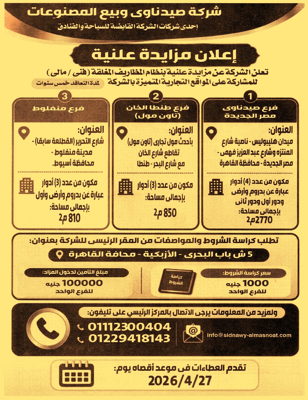 (1) فرع صيدناوي مصر الجديدة بميدان هليوبوليس – ناصية شارع المنتزه وشارع عبد العزيز فهمي – مصر الجديدة – محافظة القاهرة