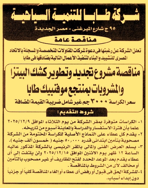 HOT Information مناقصة عامة لعملية تجديد وتطوير كشك البيتزا والمشروبات بمنتجع موفنبيك طابا (فترة الاستفسار والدراسة والمعاينة أسبوع من تاريخ الإعلان وللشركة الحق في قبول أو رفض أي عطاء أو إلغاء المناقصة بدون إبداء الأسباب) عن جريدة الأهرام Post navigation الشركة القابضة لكهرباء مصر شركة مطاحن مصر الوسطى