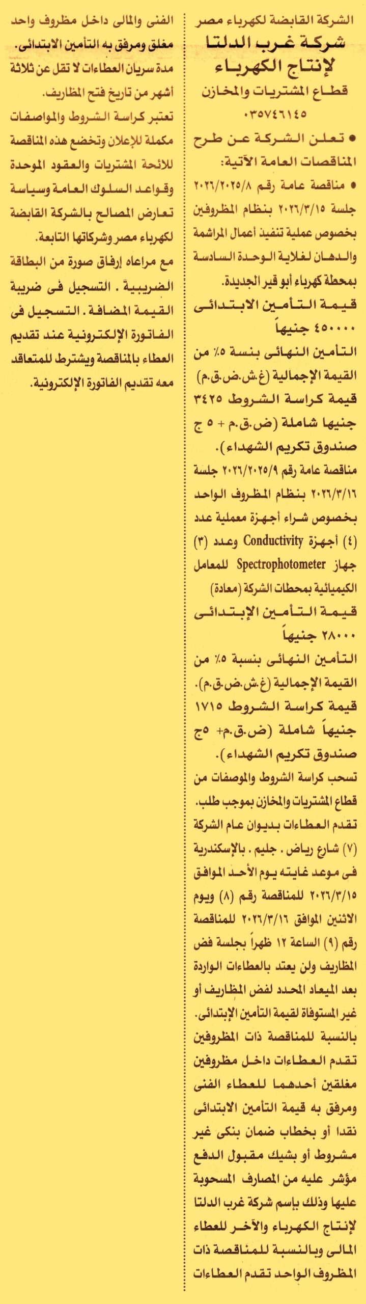 HOT Information مناقصة عامة رقم 8/2025/2026 لعملية تنفيذ أعمال المراشمة والدهان لغلاية الوحدة السادسة بمحطة كهرباء أبو قير الجديدة (مدة سريان العطاءات 3 أشهر) عن جريدة الأهرام Post navigation شركة شمال القاهرة لتوزيع الكهرباء الهيئة المصرية لسلامة الملاحة البحرية