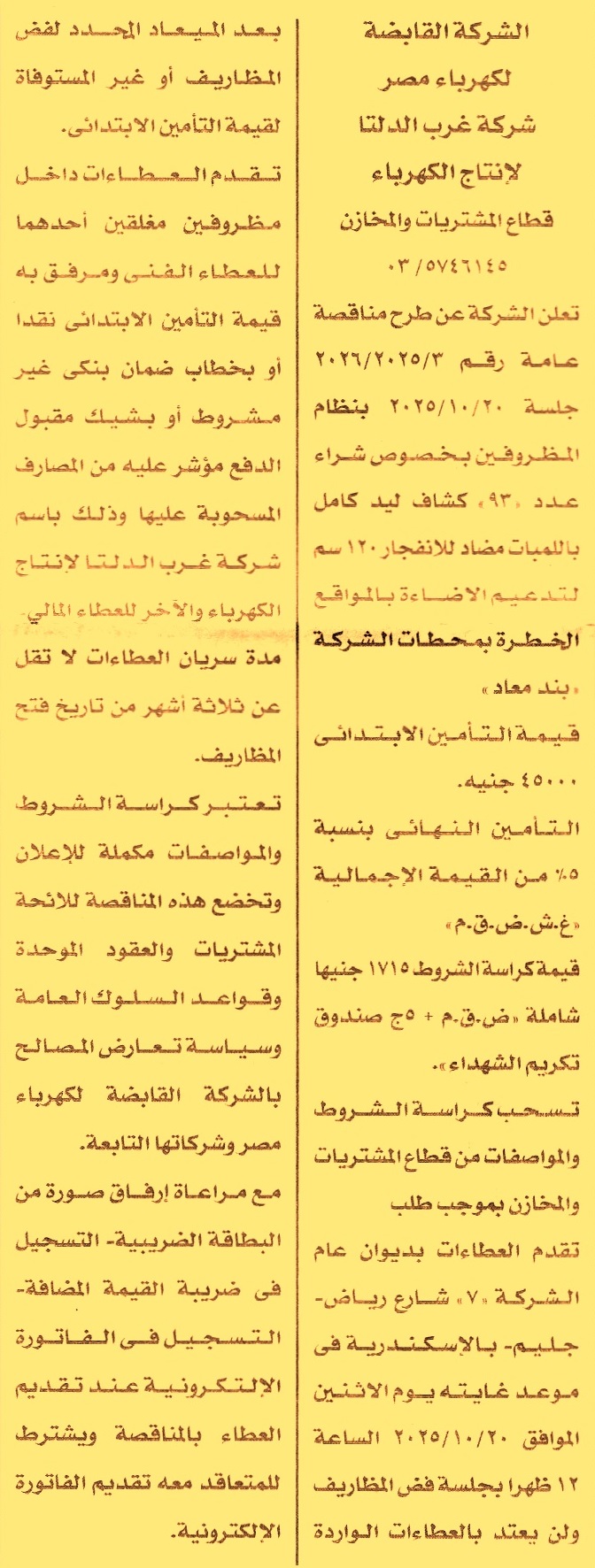 HOT information إعادة مناقصة عامة رقم 3/2025/2026 لعملية توريد عدد 93 كشاف ليد كامل باللمبات مضاد للانفجار 120سم لتدعيم الإضاءة بالمواقع الخطرة بمحطات الشركة (مدة سريان العطاءات 3 أشهر) عن جريدة الأخبار Post navigation شركة القاهرة للأدوية والصناعات الكيماوية مستشفى الحسين الجامعي